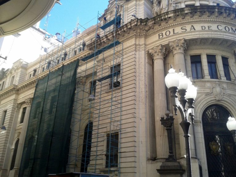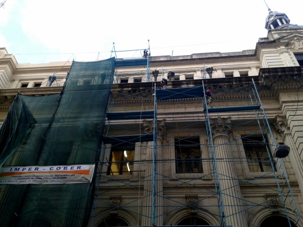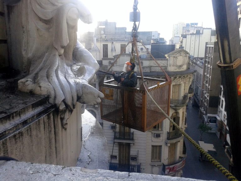 Secuencia de imagenes del armado de los andamios, protección para peatones y tareas de hidrolavado con grua de elevación.